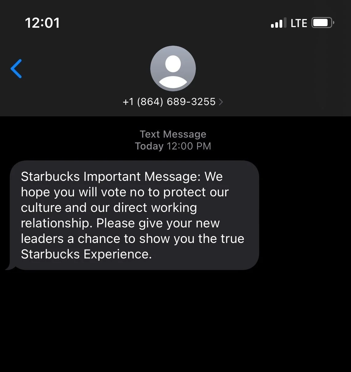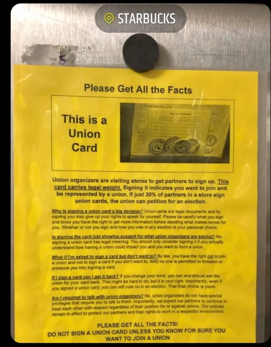 This is an example of union-busting from Starbucks. You can see how Starbucks is trying to prevent workers from signing union cards by using legal jargon and making it seem scary.
