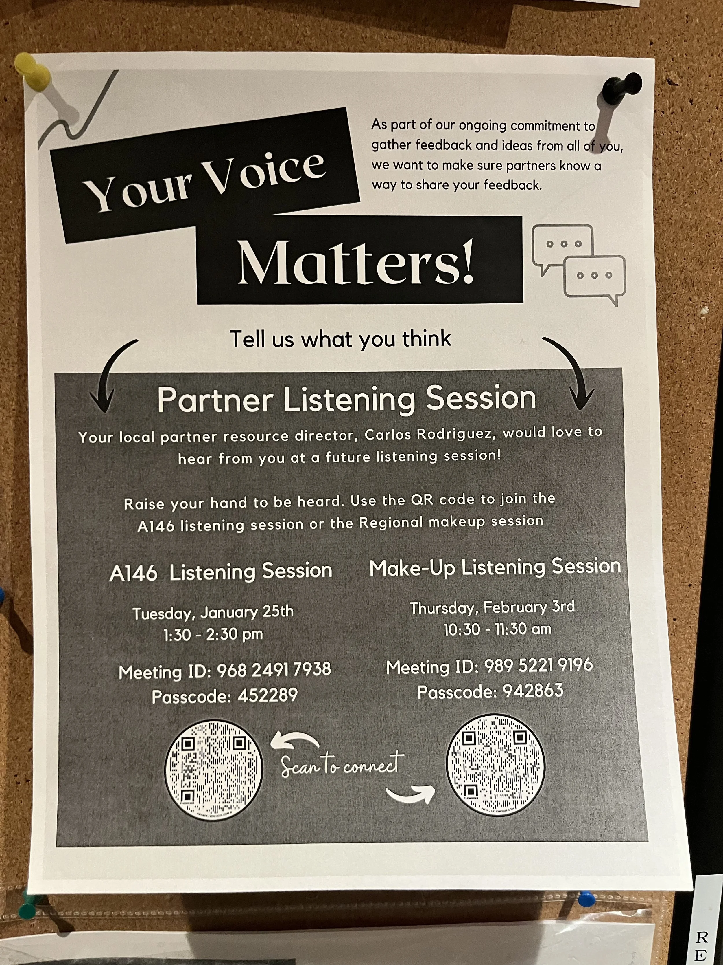 This is another example of typical union-busting. Often times companies will suddenly start hosting “listening sessions” to get worker feedback when they’ve never done things like this in the past. While it is a good thing for companies to listen to their workers, without a union, they can choose to listen or disregard feedback. With a union, companies are legally required to bargain with workers over wages, benefits & working conditions!